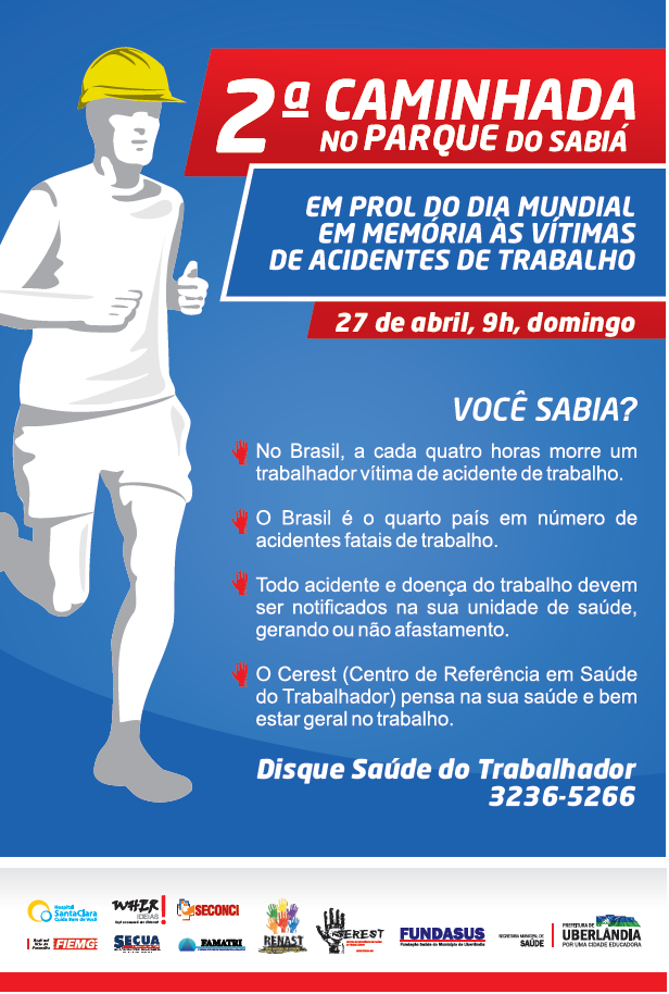 Cerca de 150 pessoas participaram da caminhada em prol do Dia Mundial em Memória às Vítimas de Acidentes de Trabalho. O ato foi realizado no Parque do Sabiá e organizado pelo Centro de Referência em Saúde do Trabalhador (Cerest) - órgão ligado a Secretaria Municipal de Saúde, com a participação do Fórum em Saúde e Segurança do Trabalhador do Triângulo Mineiro, em parceria com o Sindicato dos Técnicos de Segurança do Trabalho do Estado de Minas Gerais (Sintest – MG).