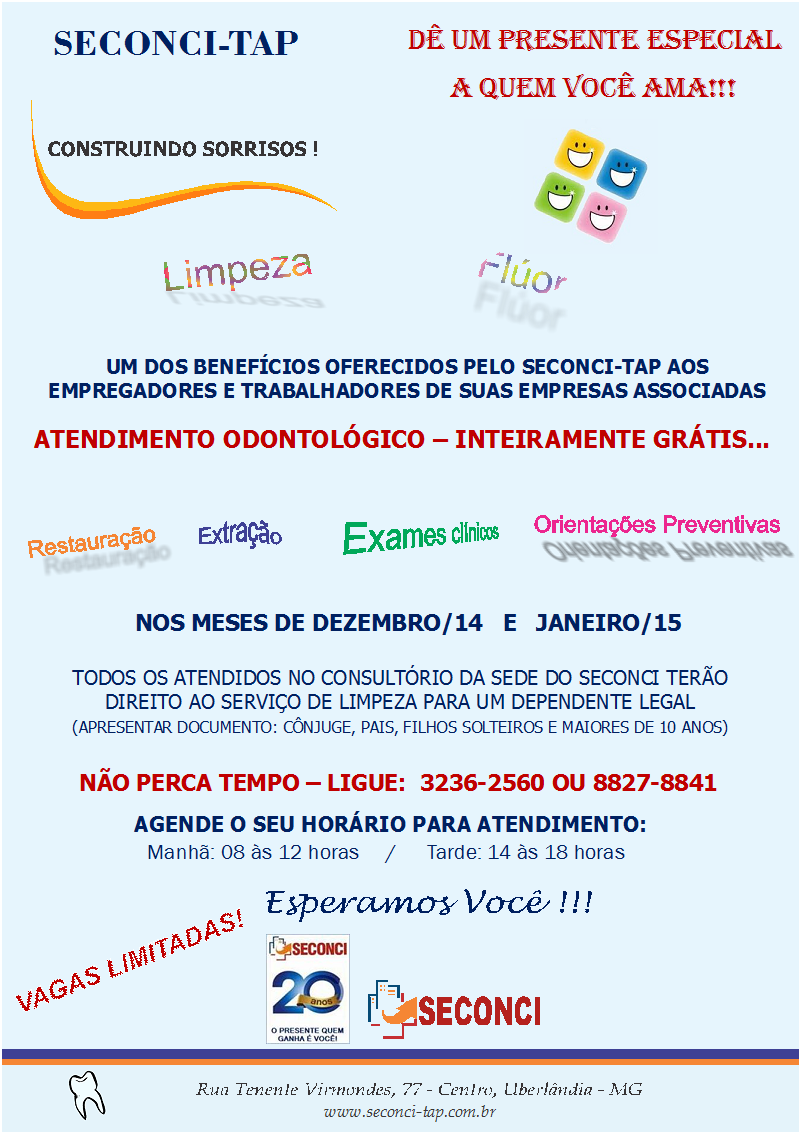 Além da divulgação da marca e dos serviços Seconci-TAP, a Campanha consiste em: todos os atendidos no consultório da sede, nos meses de dezembro/14 e janeiro/15, terão direito ao serviço de limpeza para um dependente legal (cônjuge, pais, filhos solteiros e maiores de 10 anos).