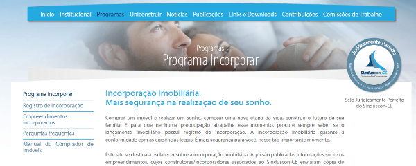 O Sindicato da Indústria da Construção Civil do Ceará (Sinduscon-CE) possui uma seção em seu site destinada ao Programa Incorporar, que visa proporcionar mais segurança na realização do sonho da casa própria. Para que nenhuma preocupação atrapalhe essa conquista do consumidor, é interessante procurar sempre saber se o lançamento imobiliário possui registro de incorporação. A incorporação imobiliária garante a conformidade com as exigências legais. O site se destina a esclarecer sobre a incorporação imobiliária. Nele são publicadas informações sobre os empreendimentos, cujos construtores/incorporadores associados ao Sinduscon-CE enviaram cópia do registro de incorporação, solicitando divulgação. No entanto, alguns empreendimentos podem não estar no site. Dessa forma, para ter certeza de que um empreendimento está realmente em dia com todos os documentos, é imprescindível solicitar a matrícula do Registro de Incorporação à construtora/incorporadora e dirigir-se ao cartório onde foi efetuado o registro para conferência. A iniciativa é positiva porque gera segurança e transparência para todos. Mais informações, clique aqui.