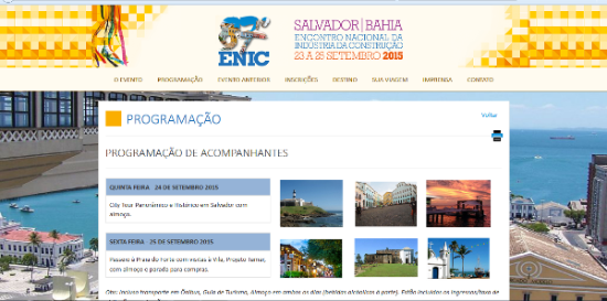 Já estão disponíveis no site do 87º Encontro Nacional da Indústria da Construção (Enic) a Programação de Acompanhantes nos dias 24 e 25 de setembro. Na quinta-feira (24/09), haverá um city tour panorâmico e histórico em Salvador com almoço. Já na sexta-feira (25/09), conta um passeio à Praia do Forte com vistas à Vila, Projeto Tamar, com almoço e parada para compras. No passeio estão inclusos transporte em ônibus, guia de turismo, almoço em ambos os dias, ingressos/taxa de visitação nas atrações e museus. Clique aqui para mais informações.